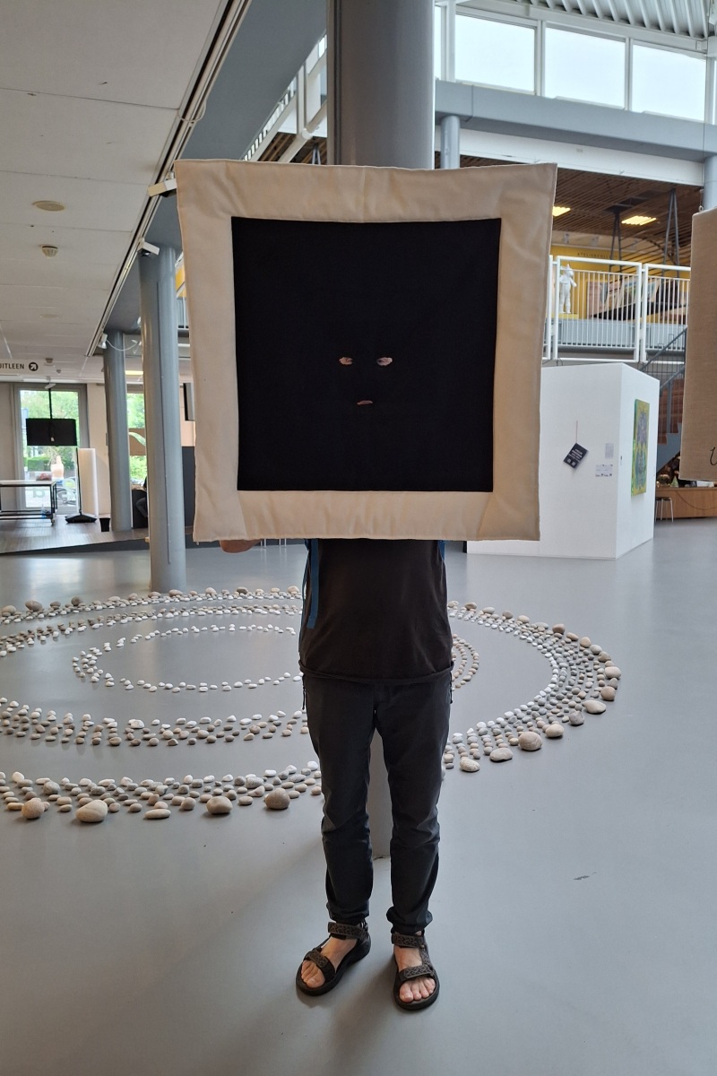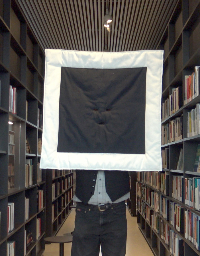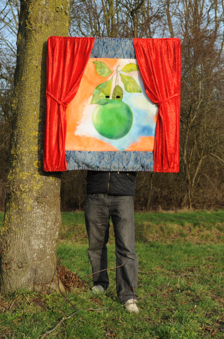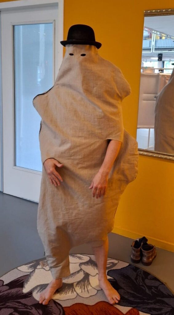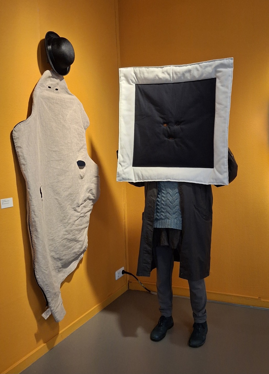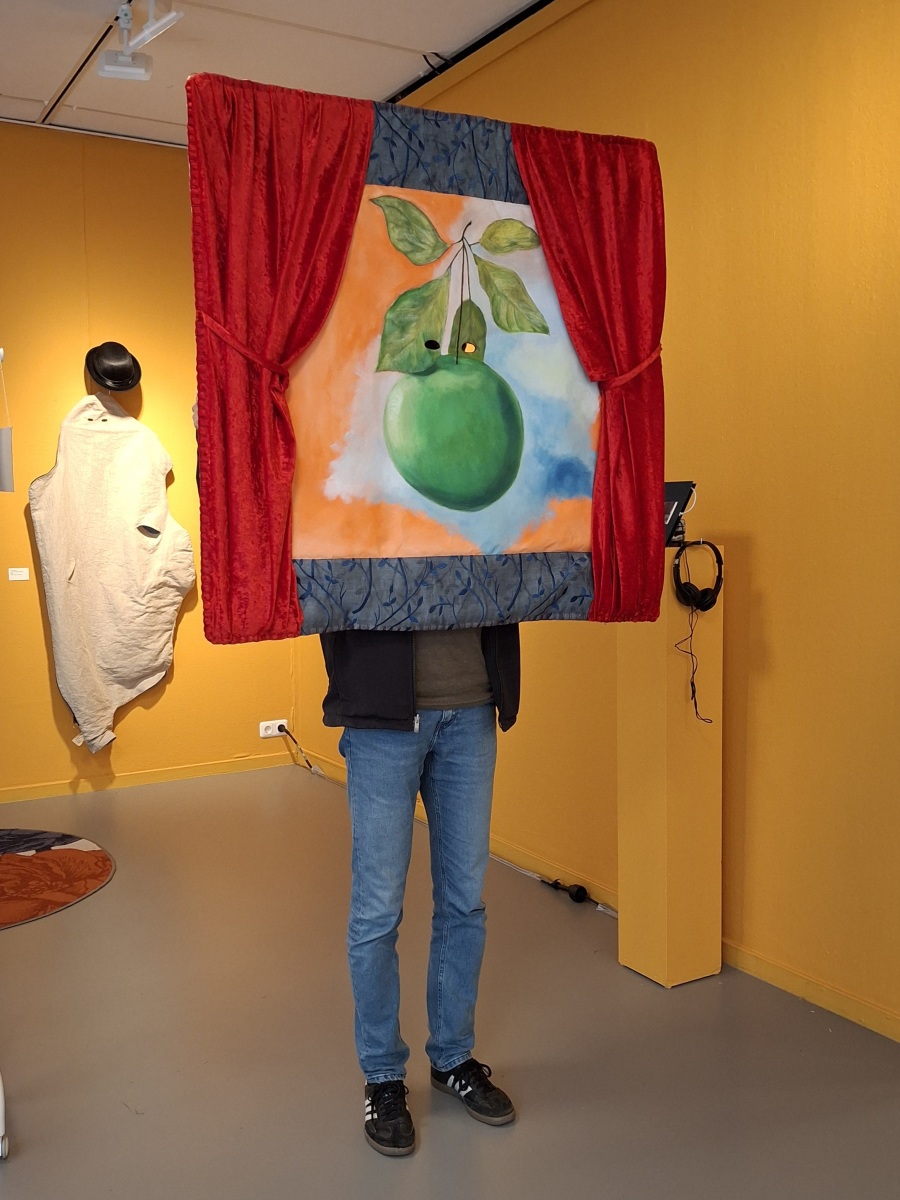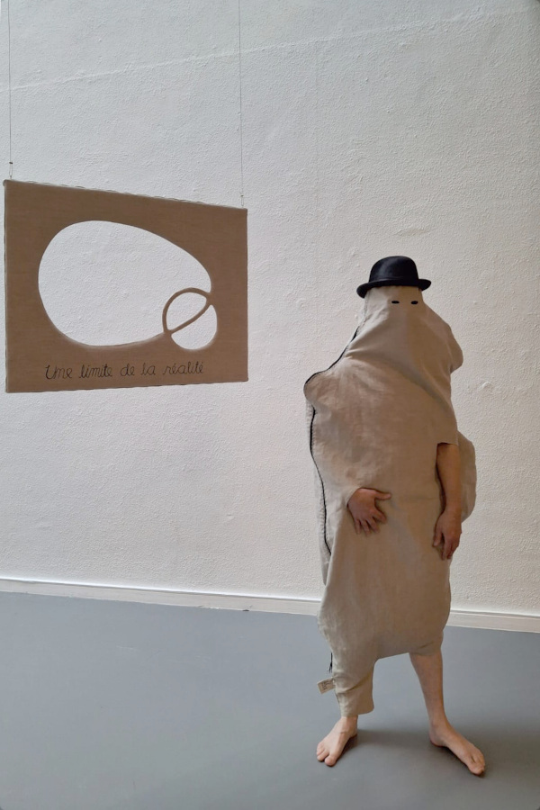 Wearable costume painting ‘Personnage de l’horizon’ – also heavily inspired by Magritte. The work explores inside-outside experience and language-perception relation in a form of an open painting, defined by it’s user.