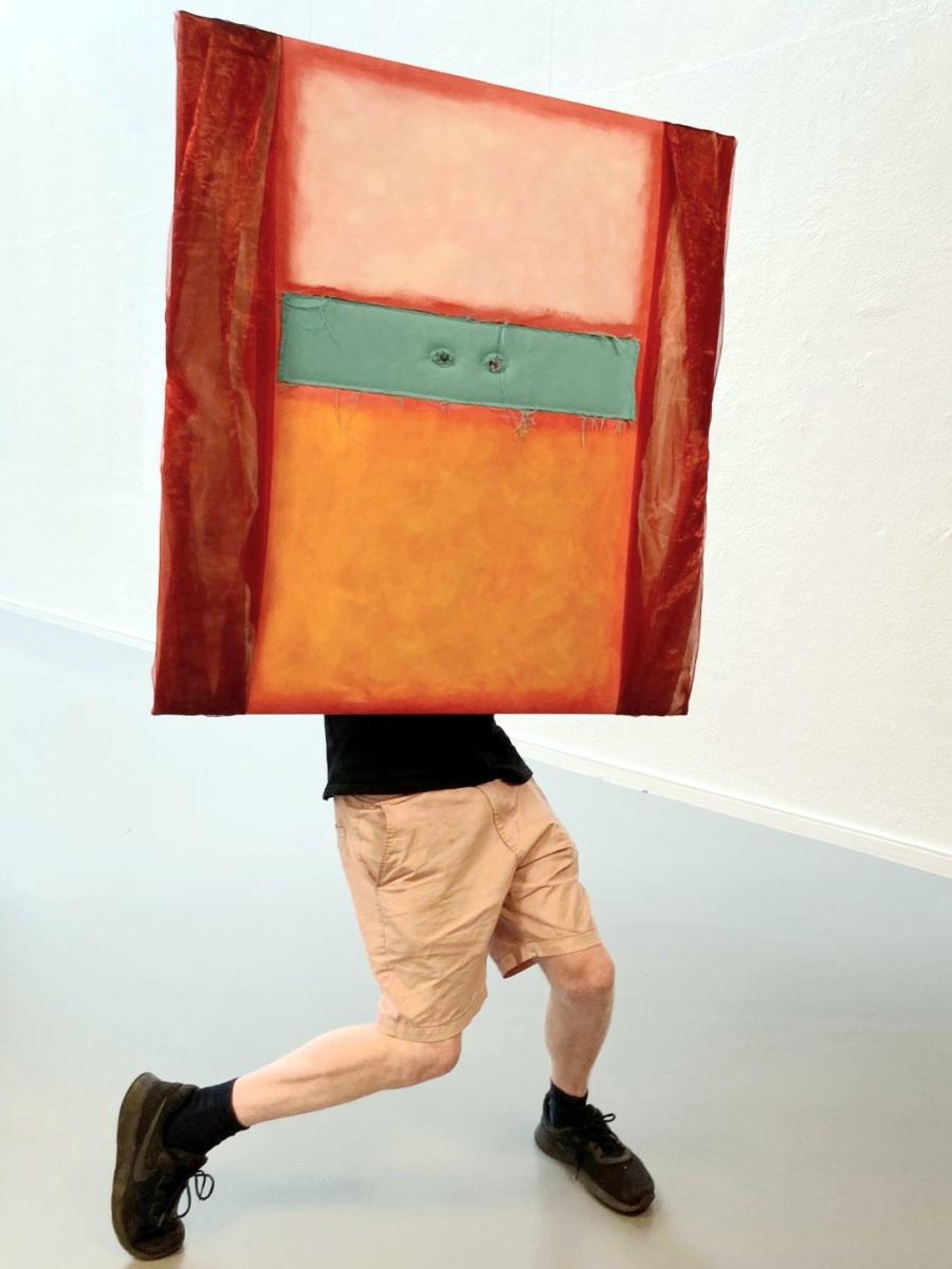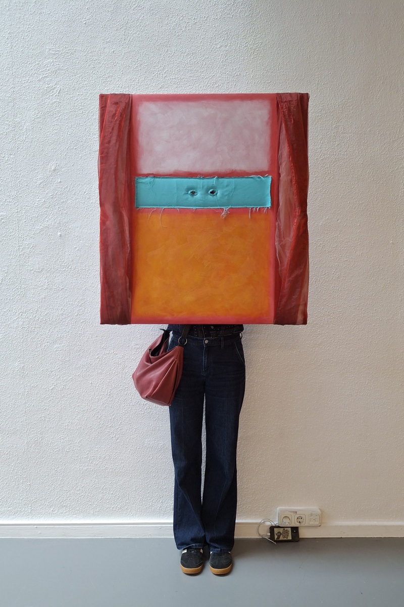 Mask is an intriguing framework for art due to its long history and direct link to human psyche. In my work it is mainly a signification of human presence. In these works I combine textile with painting creating visual objects with a mystery element. These “theatre paintings” were inspired by modernist painters as well as Magritte and his philosophical ideas. Closely related is a series of two sided soft paintings, and a full wearable costume painting. References to art history play an important role in these works which give literally a different perspective to painting.