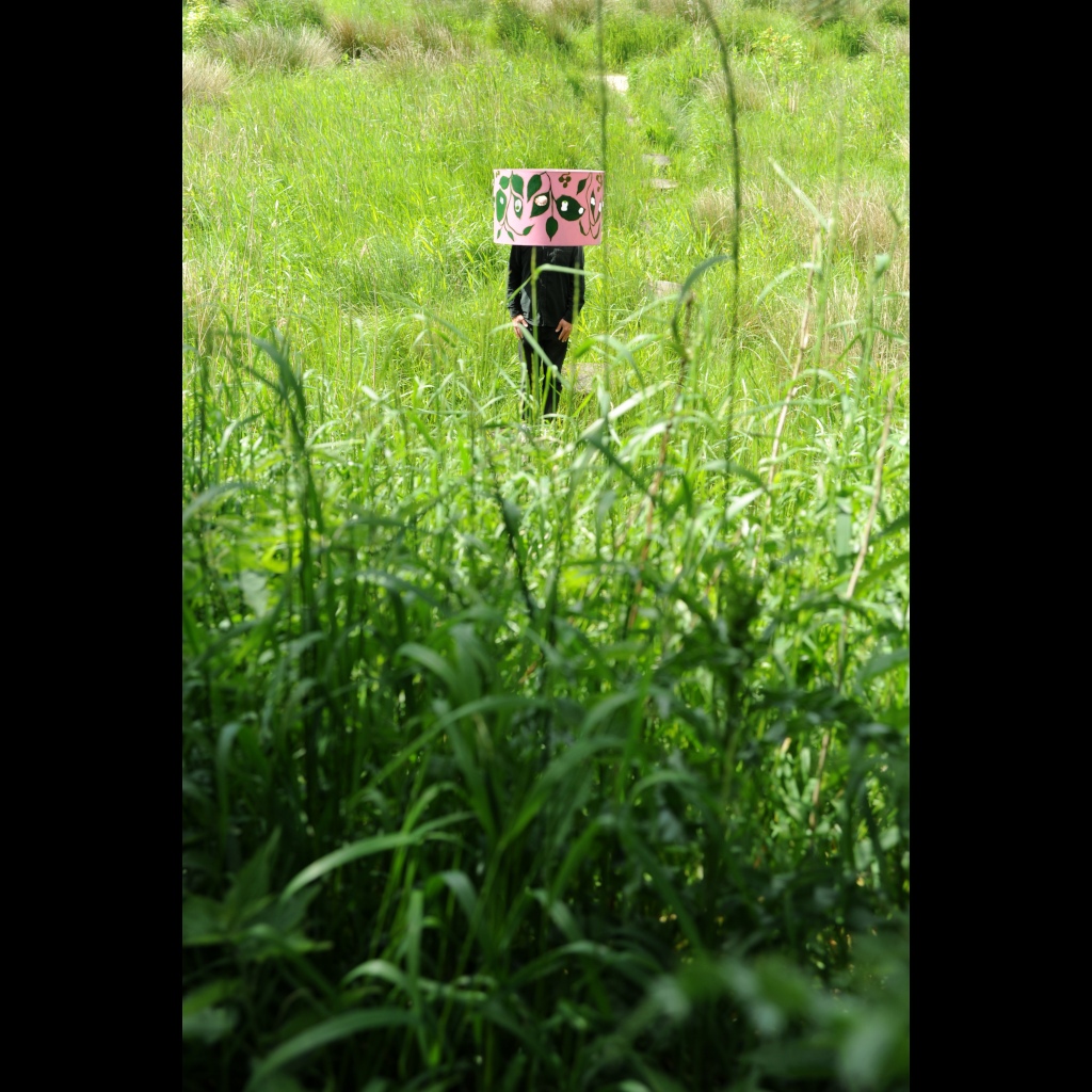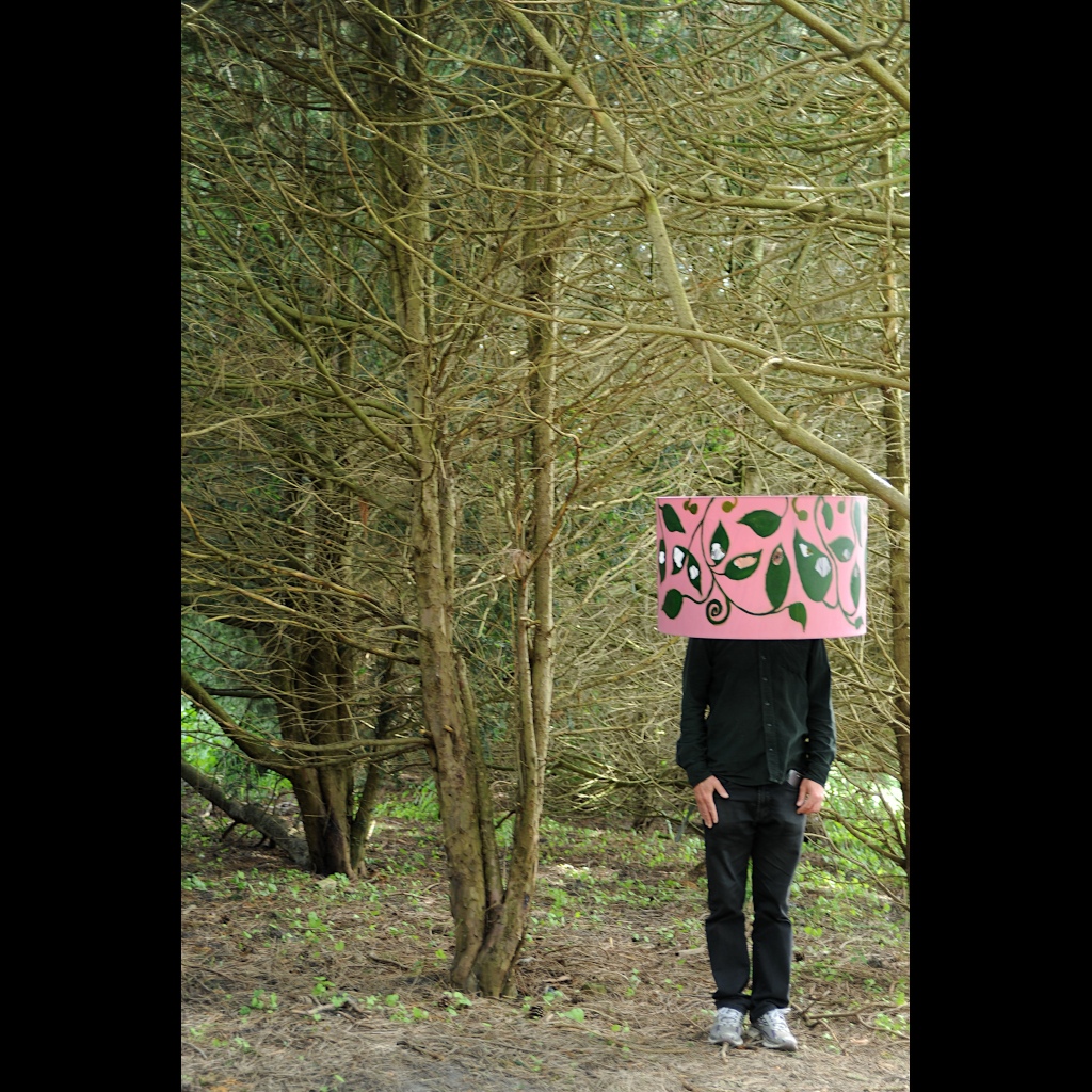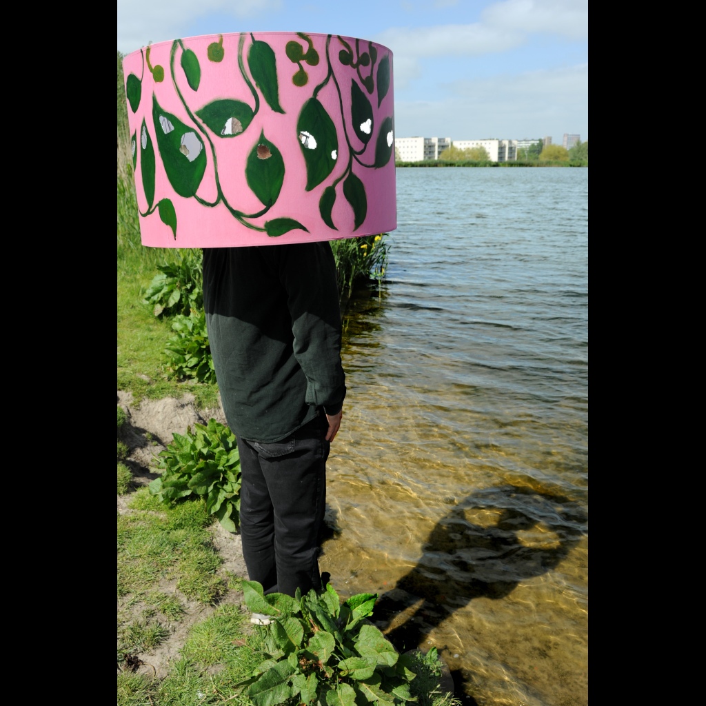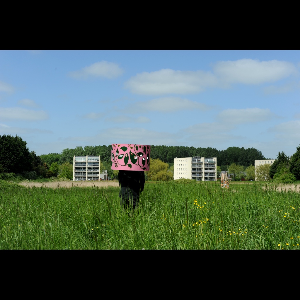 Location based investigation of experiencing the nature. The hat/helmet made from an old lamp shade provided a tool to combine private and public space, to experience awareness of the inner and outer world at the same time. It was available for the audience to use during the exhibition that took place in a garden like environment.